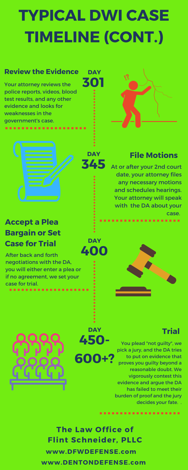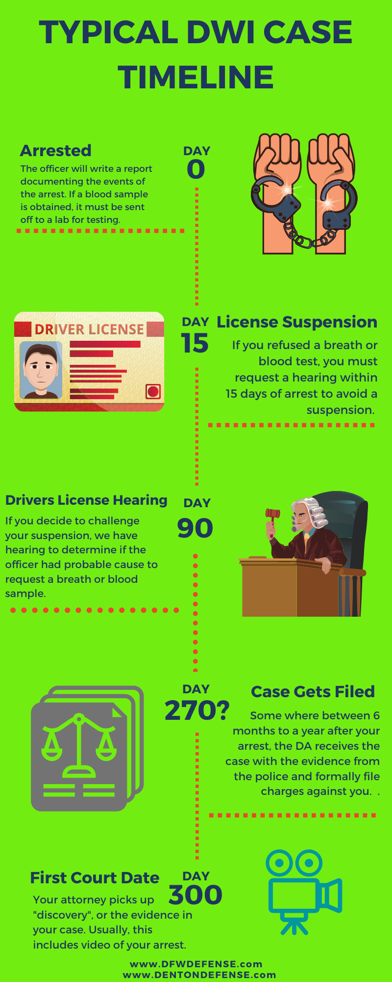If you are arrested for DWI in the DFW Metroplex—in Denton County, Dallas County, Collin County, or elsewhere— the process is pretty much the same. Your DWI charge will likely linger for many months before the charge is filed and your DWI defense attorney can begin mounting a defense in your case. The graphic below will help you understand the timeline we will be working against: